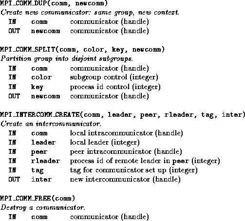 4. MPI_COMM_FREE. This function can be used to release a communicator created using the preceding three functions.